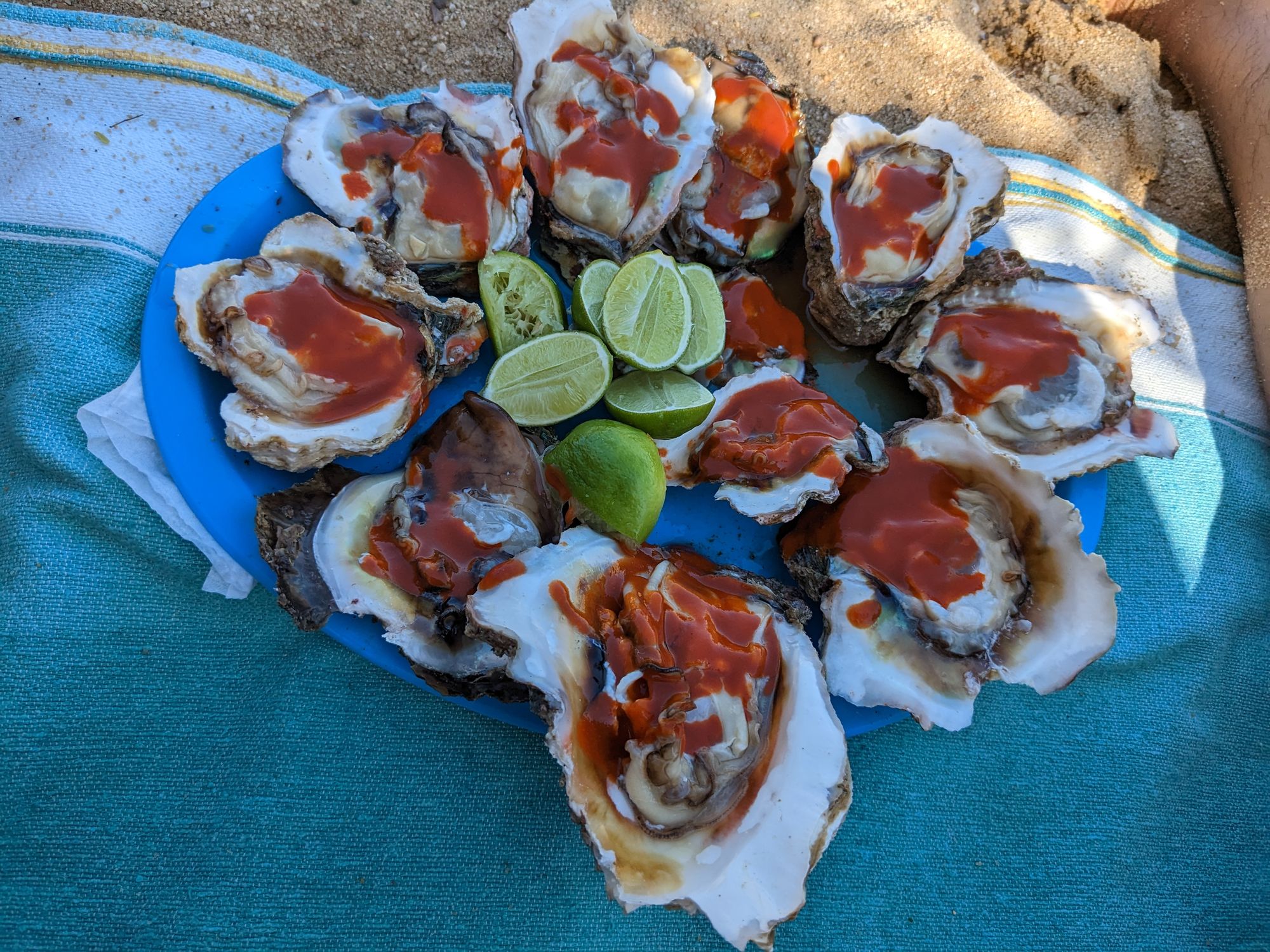 This couple was so friendly, sharing their drinks with me, and even later sharing oysters which were absolutely incredible, caught right there from the ocean. They recommended that I put hot sauce on them, and a bunch of lime. Without a doubt, these were the biggest, and best oysters I have ever tried. We ended up going to Playa Manzanillo, because when we arrived at Puerto Angelito, the small beach was completely full, with primarily locals, and the water was filled with people as well. Thankfully, Manzanillo is about a two-minute walk from Puerto Angelito, and we were able to find a nice shaded spot where we spent a good chunk of the day, relaxing and making conversation, occasionally swimming in the water as well. There was also a small cafe on the beach playing some fairly chill techno music, which created a nice vibe in the background. This beach was lined with palm trees, or "palmas" and the water was very calm, making it very good for swimming. There were lots of fishing boats at this small beach, but thankfully they were all a few hundred feet from the shore, leaving plenty of space to enjoy the water.